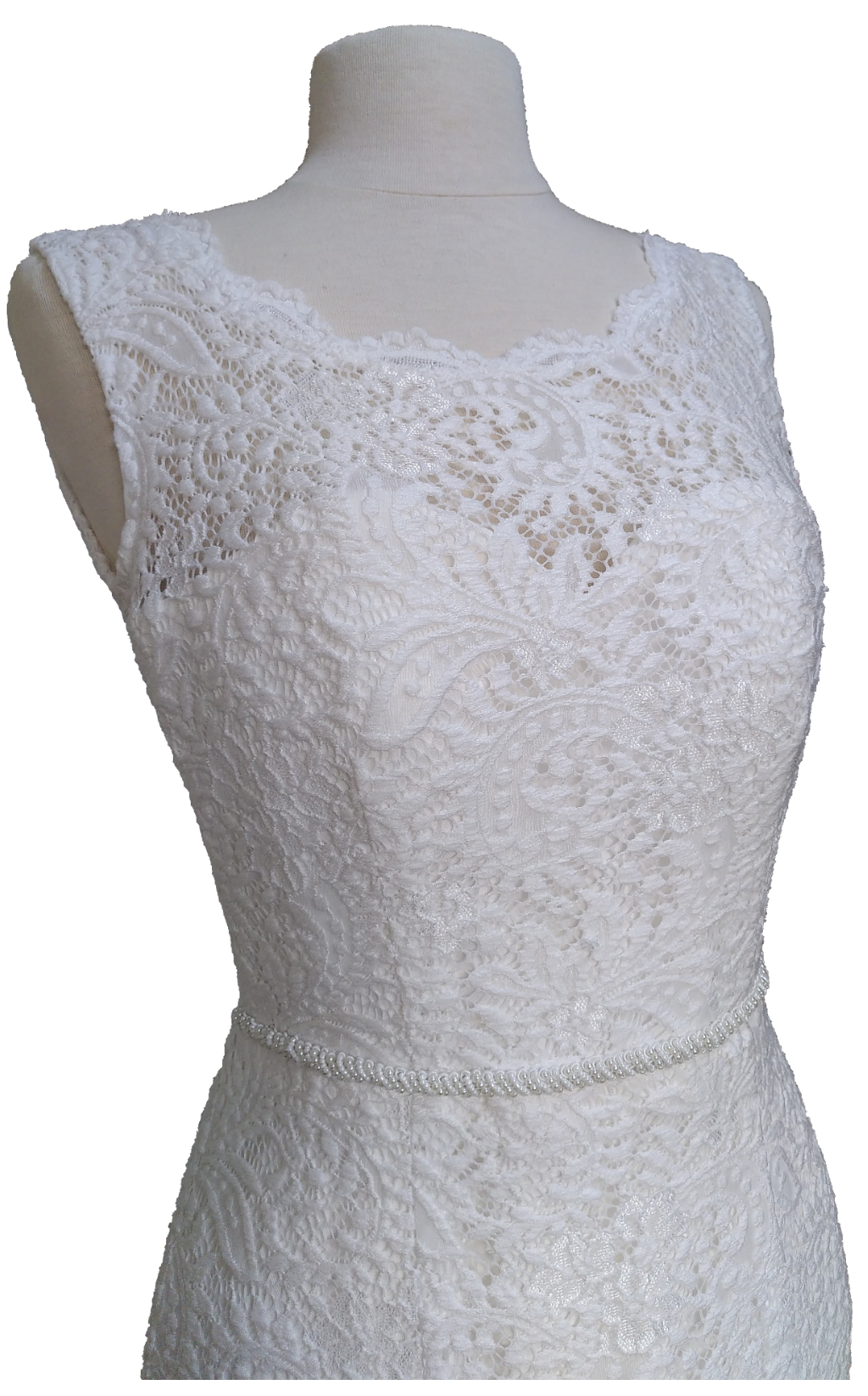 pellavamekko hääpuvuksi, asiakkaan itse kirjomat kukkakuviot rinnassa